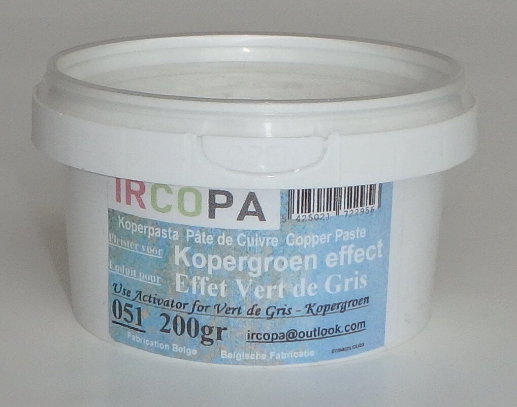 IRCOPA KOPERGROEN is een decoratieve oxidatietechniek op basis van koperpoeder voor het afwerken van muren en decoratieve objecten, maar is niet geschikt voor vloeren, exterieurs of vochtige oppervlakken. Het reproduceert exact de oxidatie van koper over een lange periode van blootstelling aan corrosie. Nadat een laag IRCOPA KOPERGROEN is aangebracht, wordt het grijsgroen geactiveerd met een geschikte traag drogende activator.